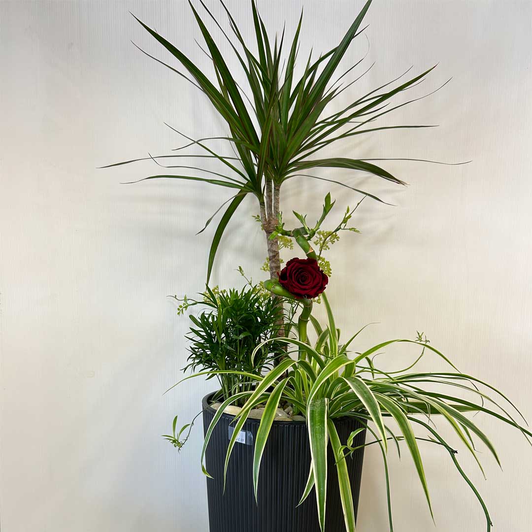 Accueil › Nos produits › Arrangement de plantes › Arrangement de plantes naturelles et artificielles – pot gris
