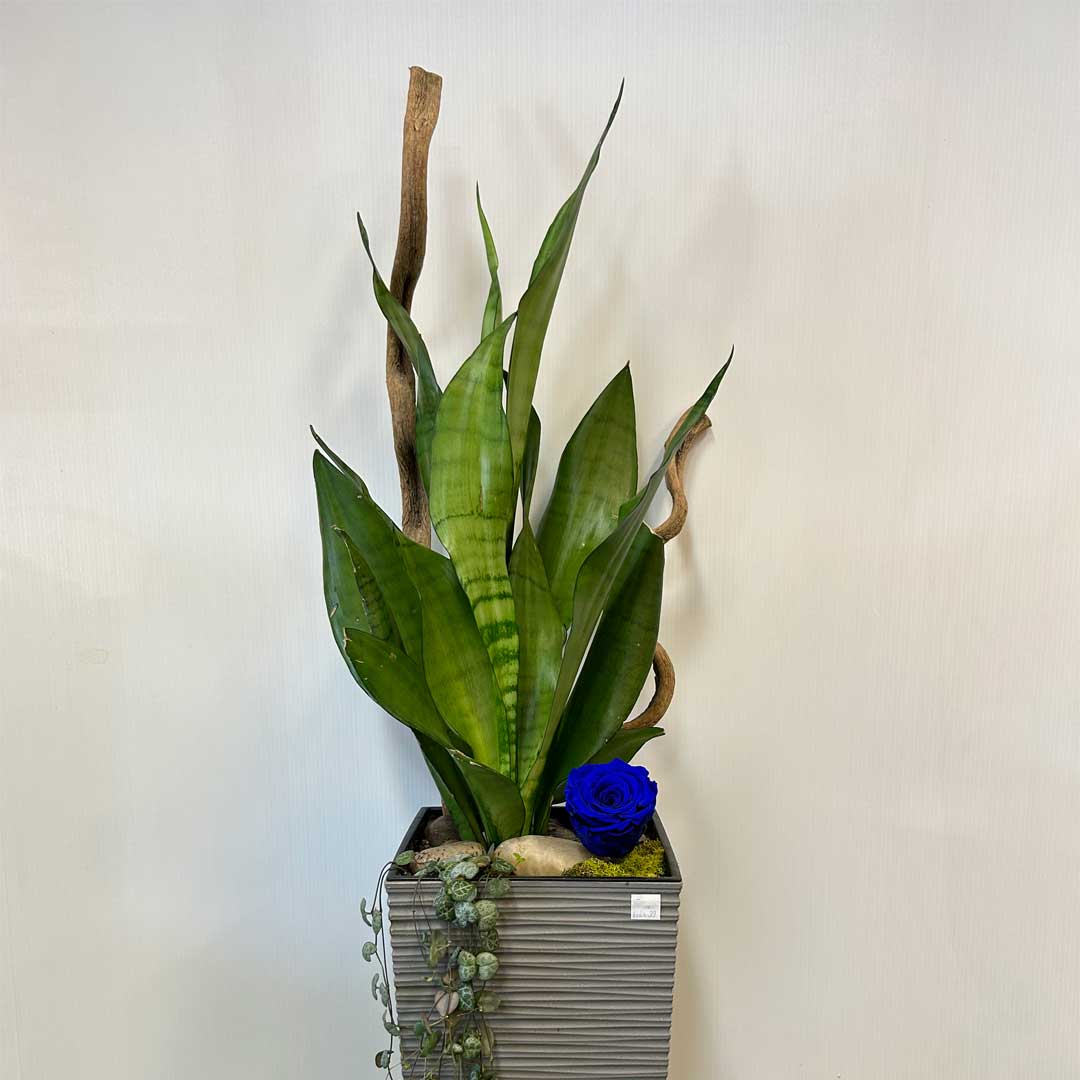 Arrangement de plantes naturelles et rose éternelle bleue – pot gris