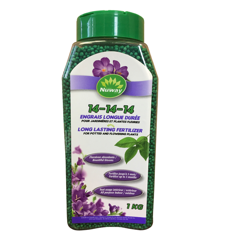 L’engrais longue durée pour jardinières 14-14-14 Nuway permet jusqu’à trois mois de fertilisation. Sa formule à dégagement lent agit pendant toute la saison et favorise l’obtention de floraisons colorées et d’un feuillage vigoureux et abondant.