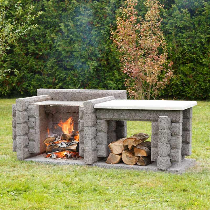 Foyer extérieur possédant un espace pour le rangement du bois ouverte par l’avant et l’arrière et une pratique tablette;